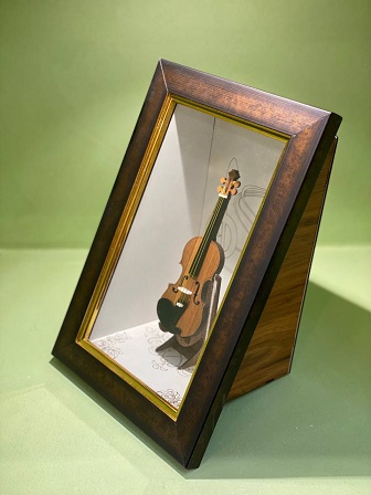 این اثر هنری، ترکیبی چشم نواز از هنر و عشق به موسیقی است. درون یک قاب چوبی شیک با حاشیه طلایی،یک ویولن مینیاتوری با جزئیاتی دقیق و زیبا بر روی پایه ای از چوب قرار گرفته است.پس زمینه این قاب با طرح هایی از نت موسیقی و کلید سل،روح هنری آن را دو چندان کرده است.